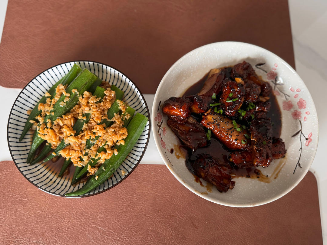 糖醋排骨,蒜蓉秋葵,还有一只小馋狗。