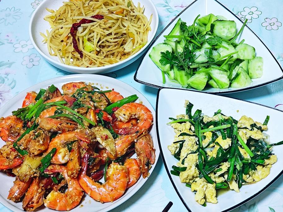 清蒸鲈鱼,虾,土豆丝,小白菜