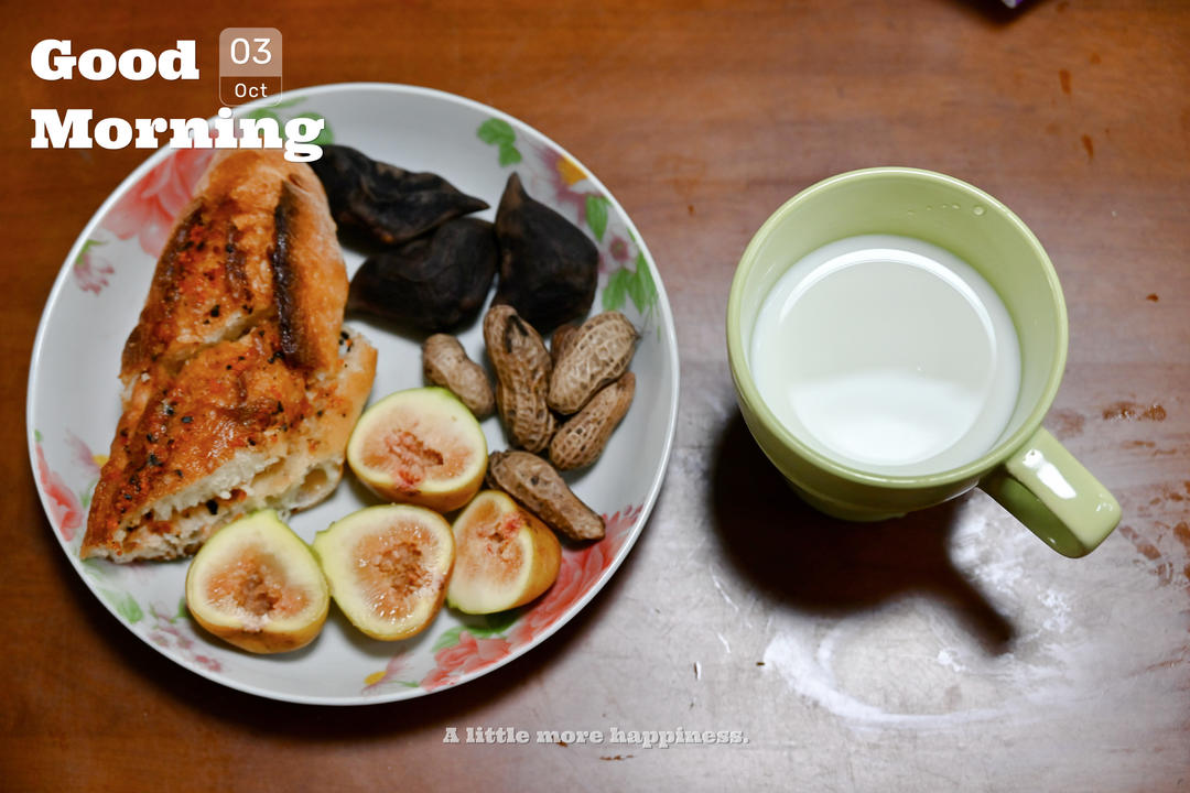 黑松露鱼籽蒜香法棍🥖+菱角花生🥜+无花果+牛奶🥛