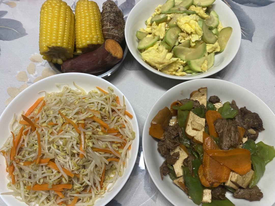 果蔬好的豆芽一如既往好吃,绿色无公害放心;自己炖的牛肉炒尖椒,西葫芦鸡蛋,蒸粗粮拼盘。