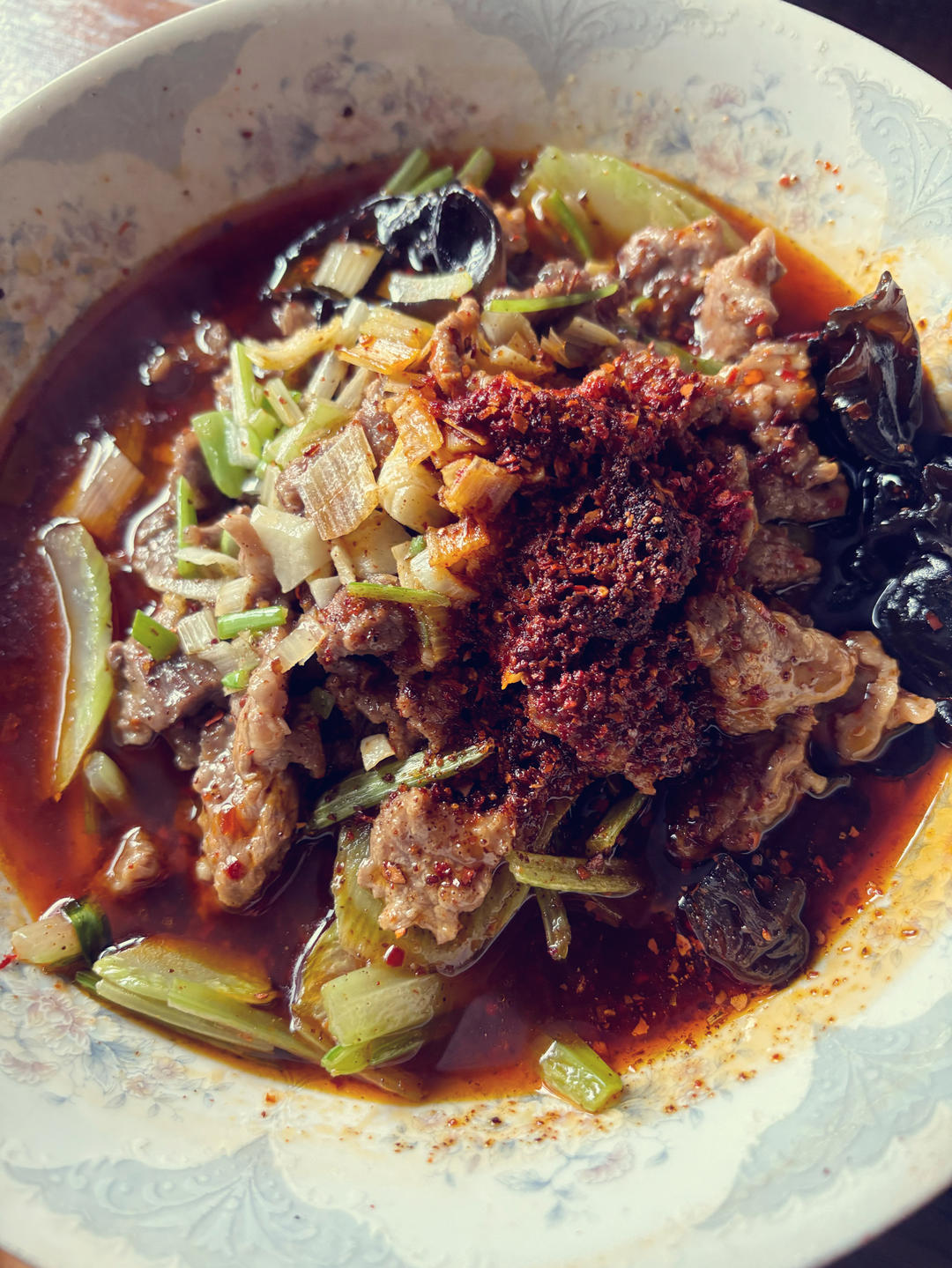 水煮牛肉、酱拌菜花;岐山擀面皮(YS);家熬海鱼(YL)