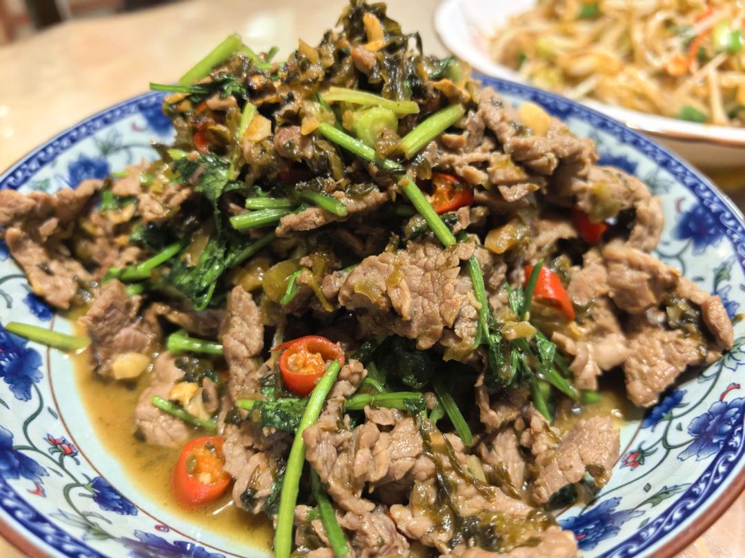买了牛里脊,忘记买泡椒和豆角就用了糟菜,居然一样好吃啊!下次油多放点,爆炒!爆炒!