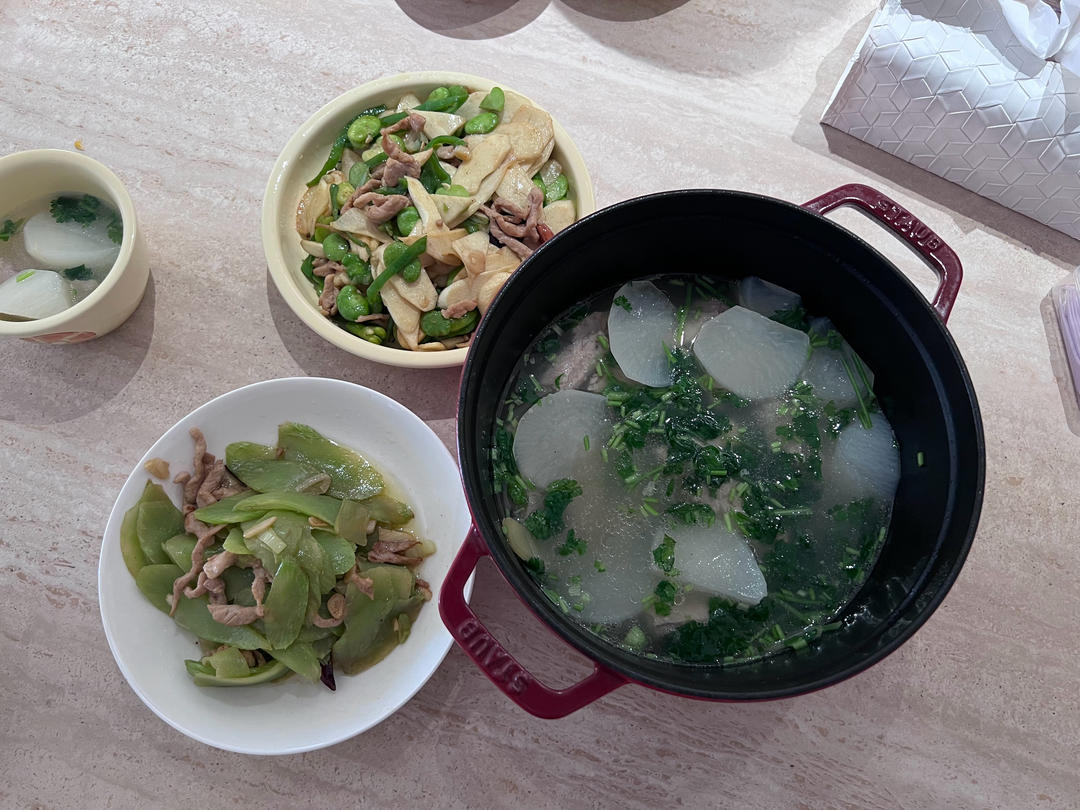 茭白炒肉,莴笋炒肉,萝卜炖排骨,米饭。