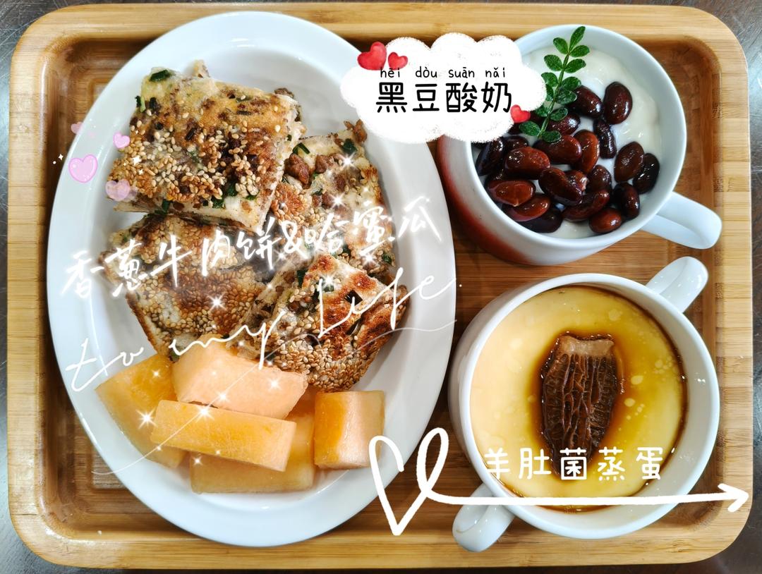 牛肉香葱饼、哈蜜瓜、黑豆酸奶、羊肚菌蒸蛋!
