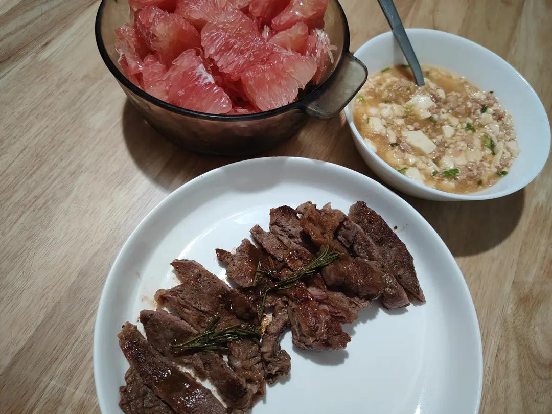 10.9~黑胡椒牛排🥩~肉沫豆腐羹~红心柚子~杂粮米糊~红糖发糕!