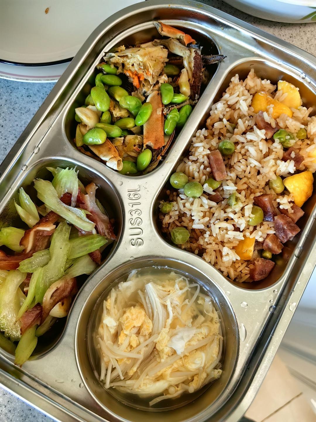 香肠板栗饭,螃蟹炒毛豆,西芹炒猪耳朵,金针菇蛋汤