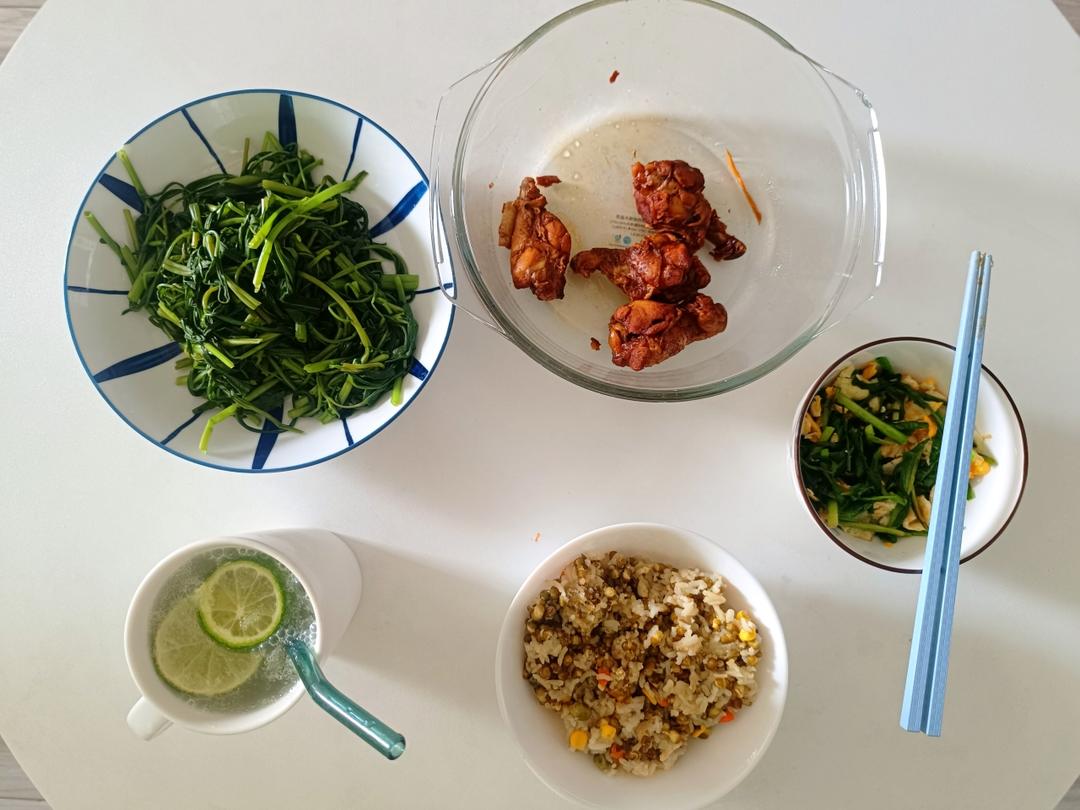 可乐鸡翅x韭菜炒蛋x水煮空心菜x冰镇柠檬苏打气泡水x杂粮饭