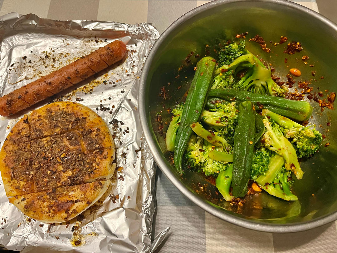 烤油馍、烤火腿肠、凉拌秋葵西兰花。2025.10.10晚餐。