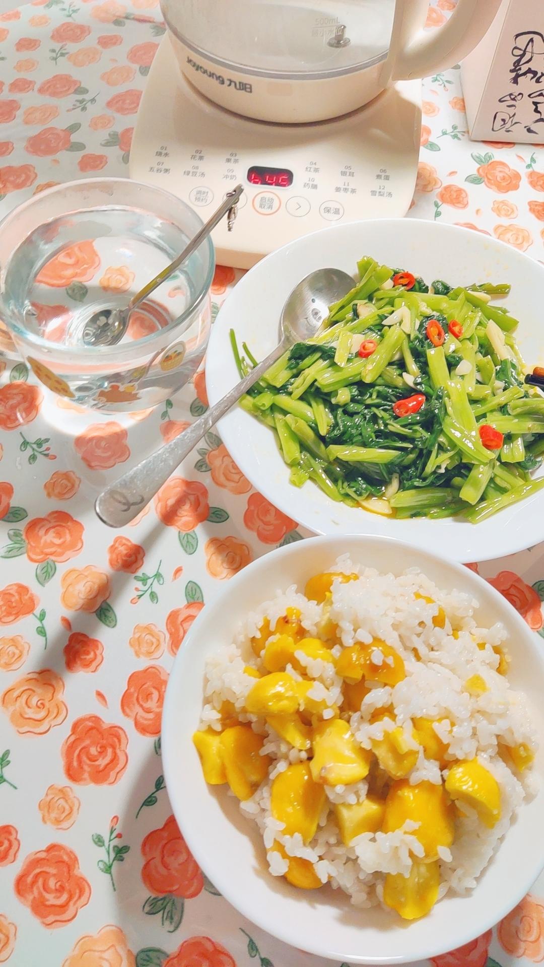 红红绿绿的真好吃,光盘。花椒油炒素菜绝了,哈哈。新买了一壶油,感觉还不错,挺香的。