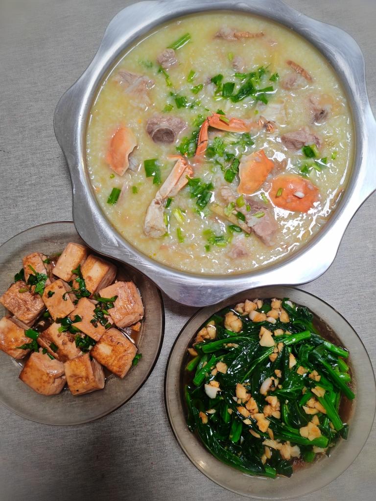 蒜蓉灼菜心苗、豉油焖车田豆腐、大闸蟹排骨砂锅粥