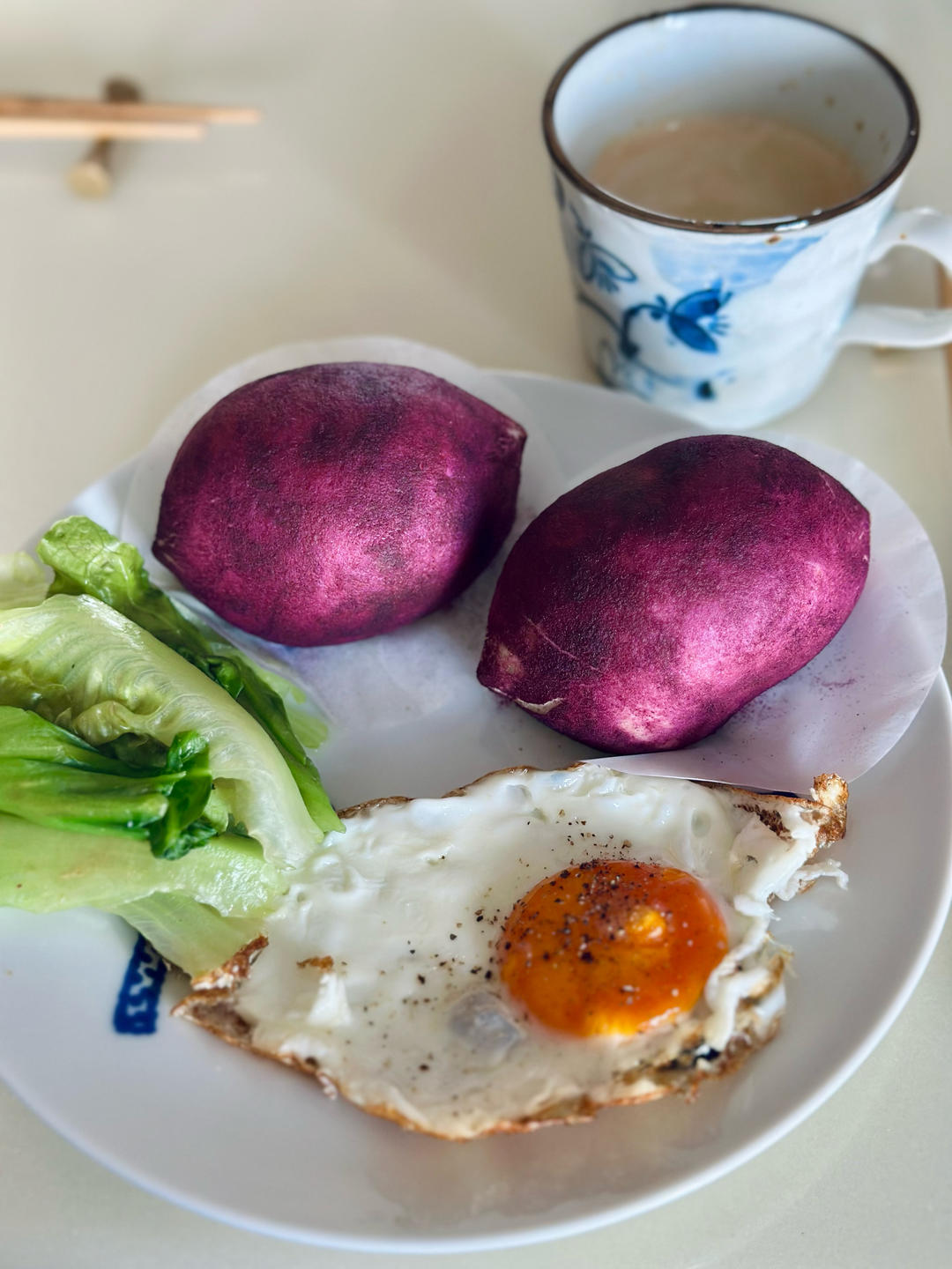拉丝奶酪紫薯包+荷包蛋+生菜