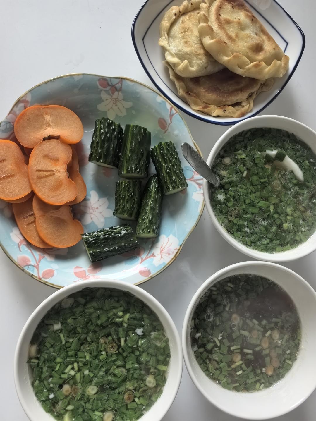 妈妈做的韭菜盒子、绿油油的荷包蛋、黄瓜、巧克力柿。最近更新频率太低。