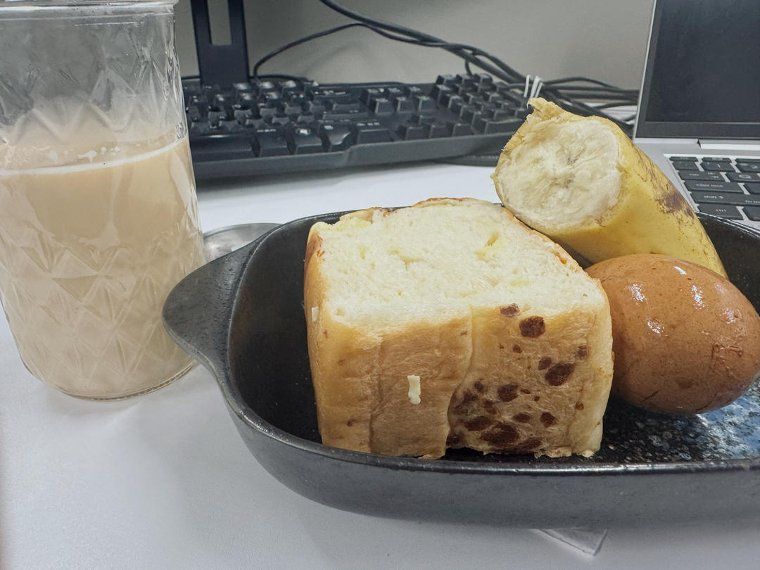 牛奶咖啡、面包、茶叶蛋、香蕉