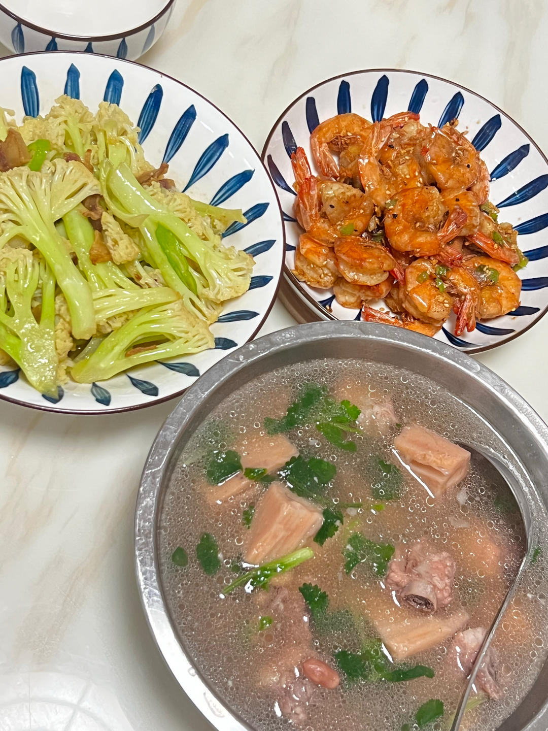 猪油渣炒花菜,椒盐虾🦐,排骨莲藕汤,藜麦米饭🍚 简单的广东味