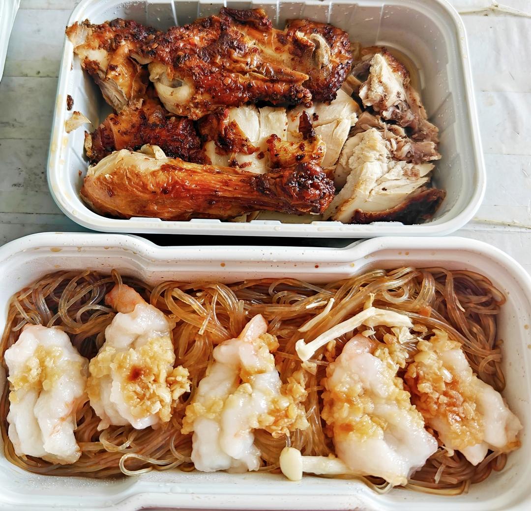 今天吃绿茶家的粉丝虾和烤鸡,粉丝虾真好吃,烤鸡是麻辣口的还可以吧,今天这俩没踩雷挺好