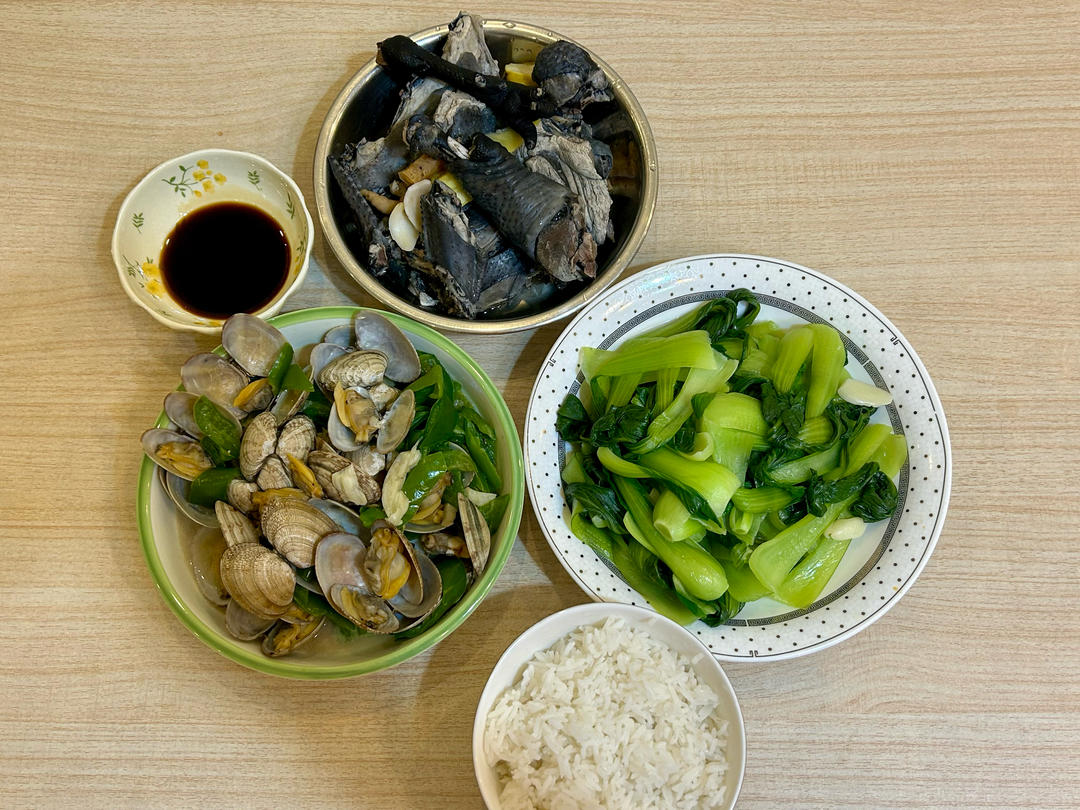 炒小菜,虾皮炒萝卜,苦瓜炒肉丝,黄焖鸡配米饭,养生豆浆