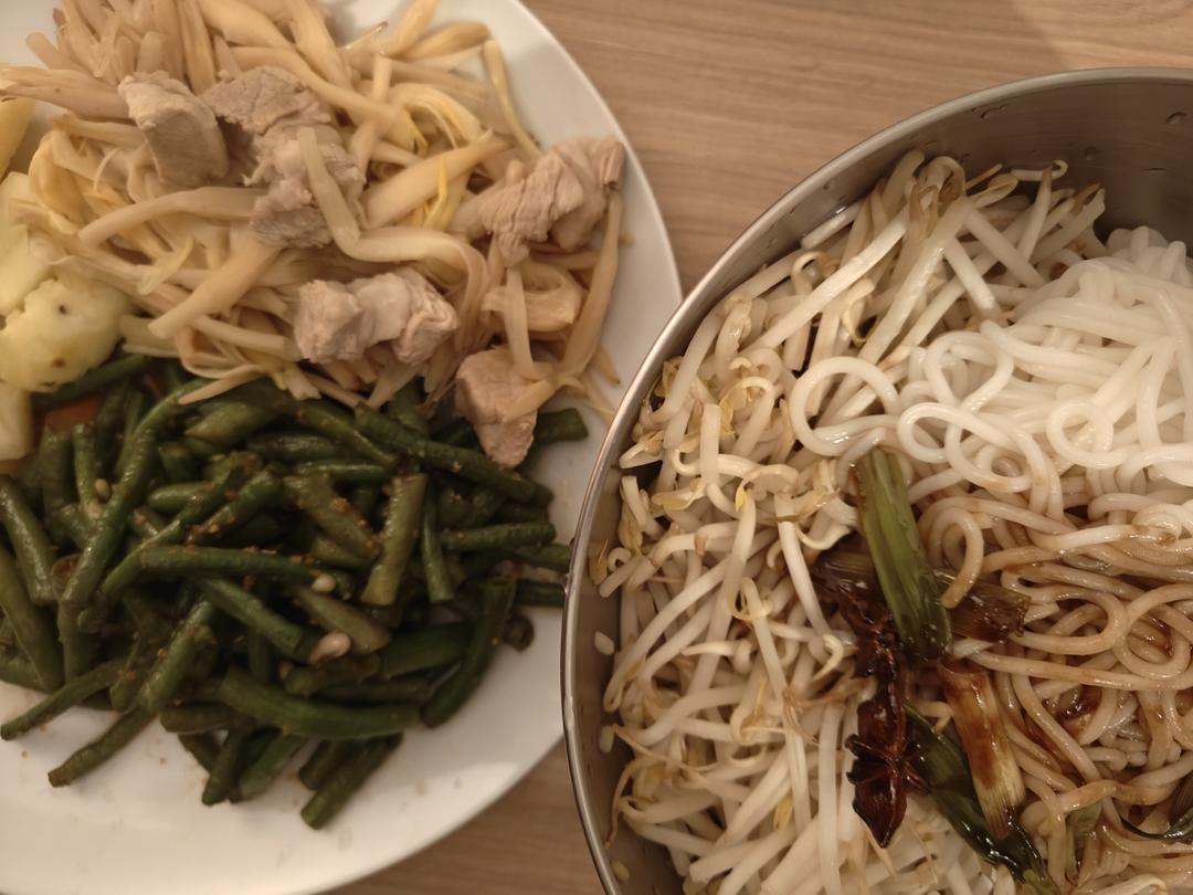 酱料(葱段大料香油橄榄油酱油海鲜酱)绿豆芽濑粉+酱油花椒油蒜粉辣椒粉豇豆+酱油金针菇猪...