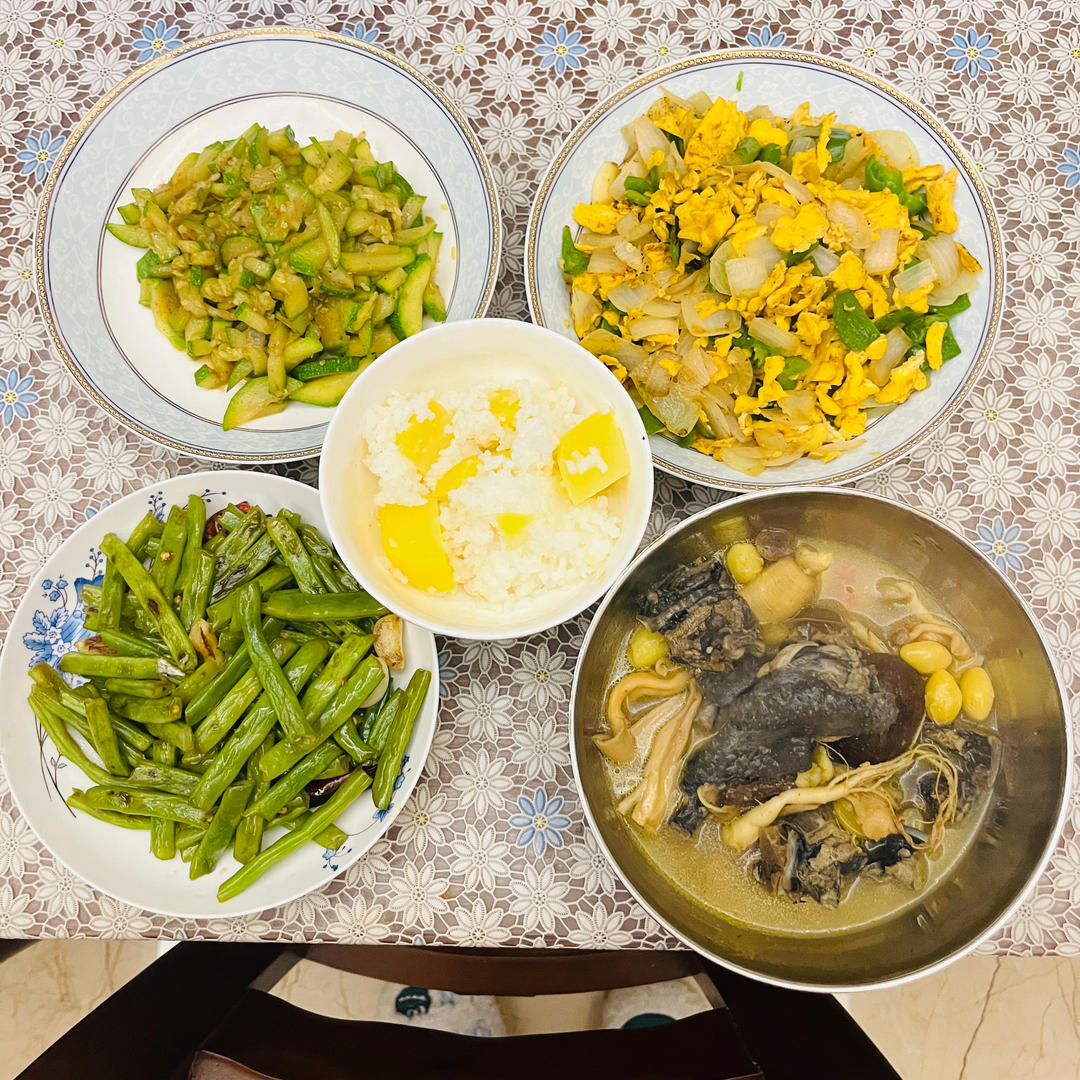 素炒西葫芦➕素炒四季豆➕洋葱辣椒炒鸡蛋(解锁一道新菜)➕乌鸡炖汤
