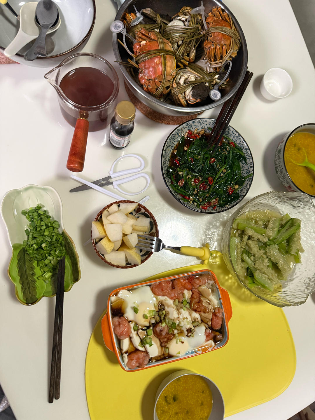 还有虾仁豆腐番茄,凉拌菠菜,炒丝瓜,蒸螃蟹