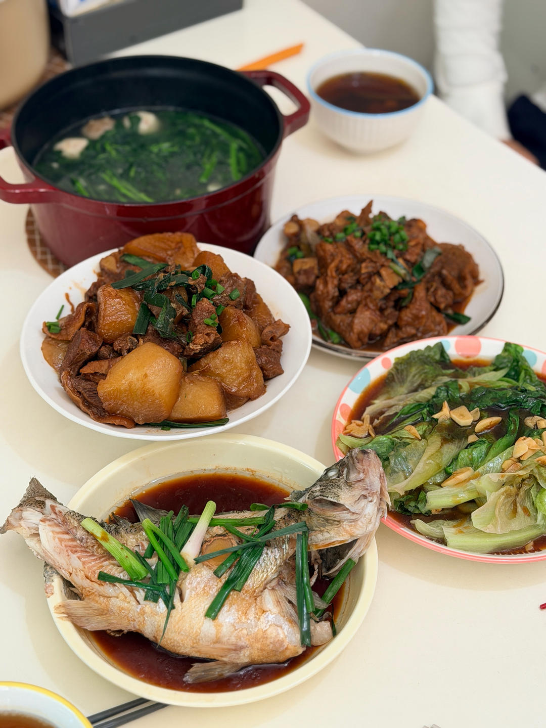 牛丸上汤西洋菜 萝卜焖牛腩 面筋焖排骨 蒸鲈鱼 蚝油生菜