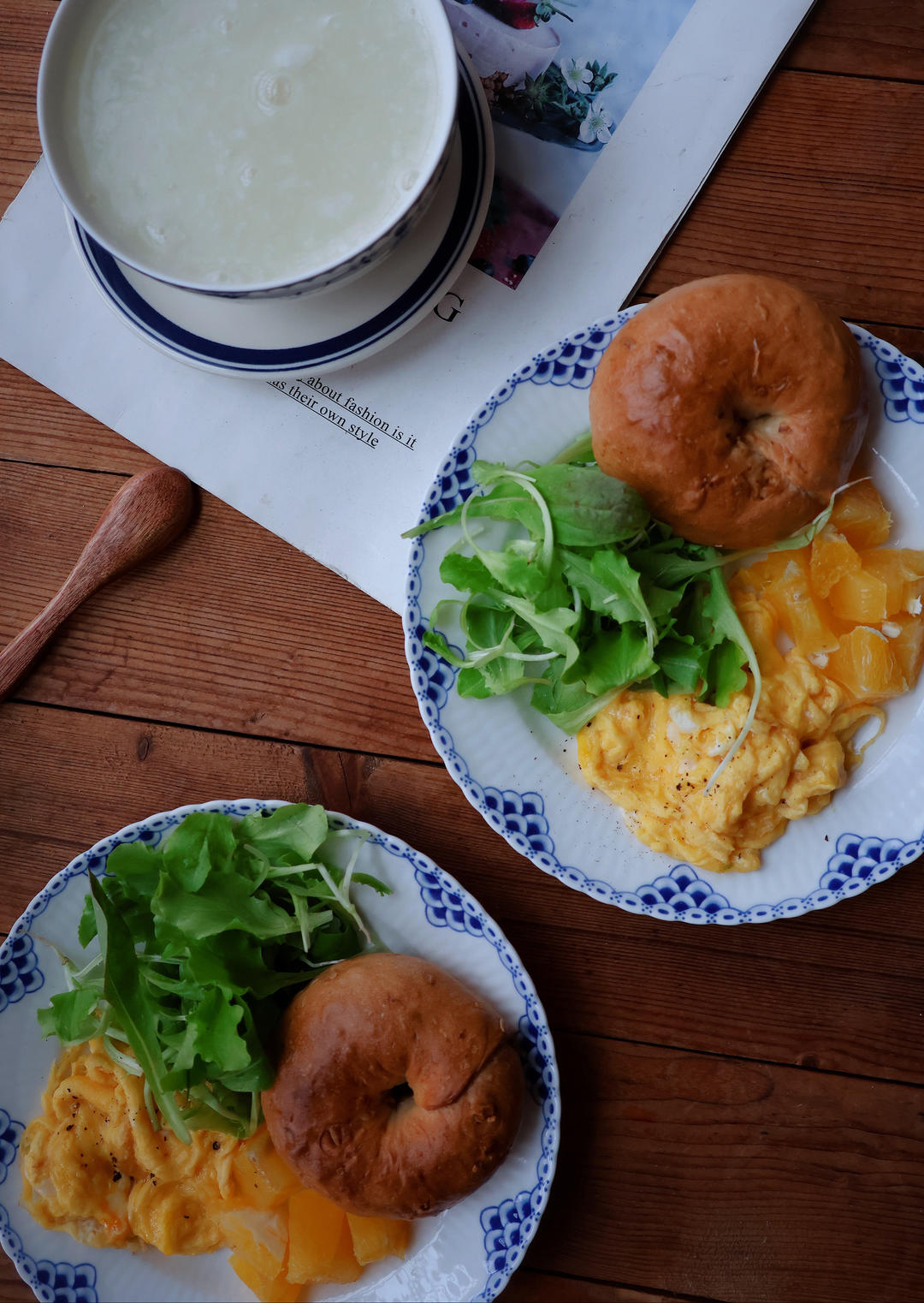 白粥,燕麦贝果,滑蛋,橙子,青菜