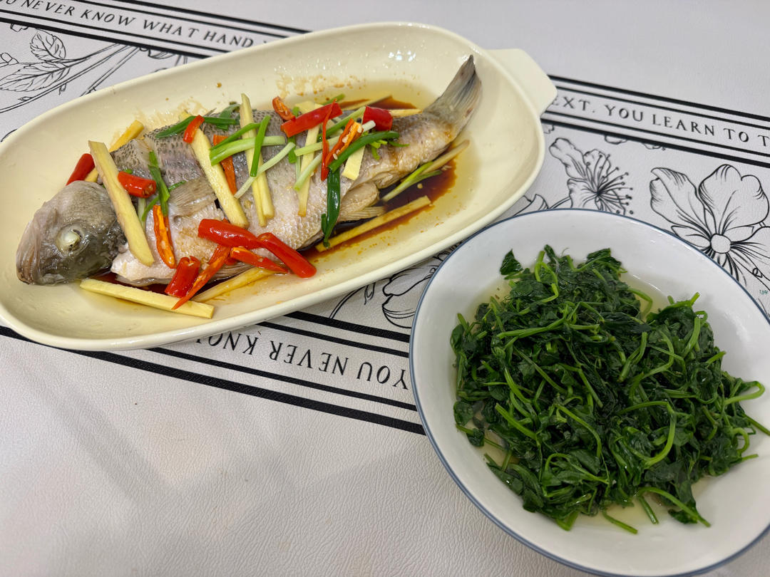 清蒸鲈鱼: 鲈鱼,葱,小米辣,蒸鱼豉油,姜,盐,料酒,花椒。
