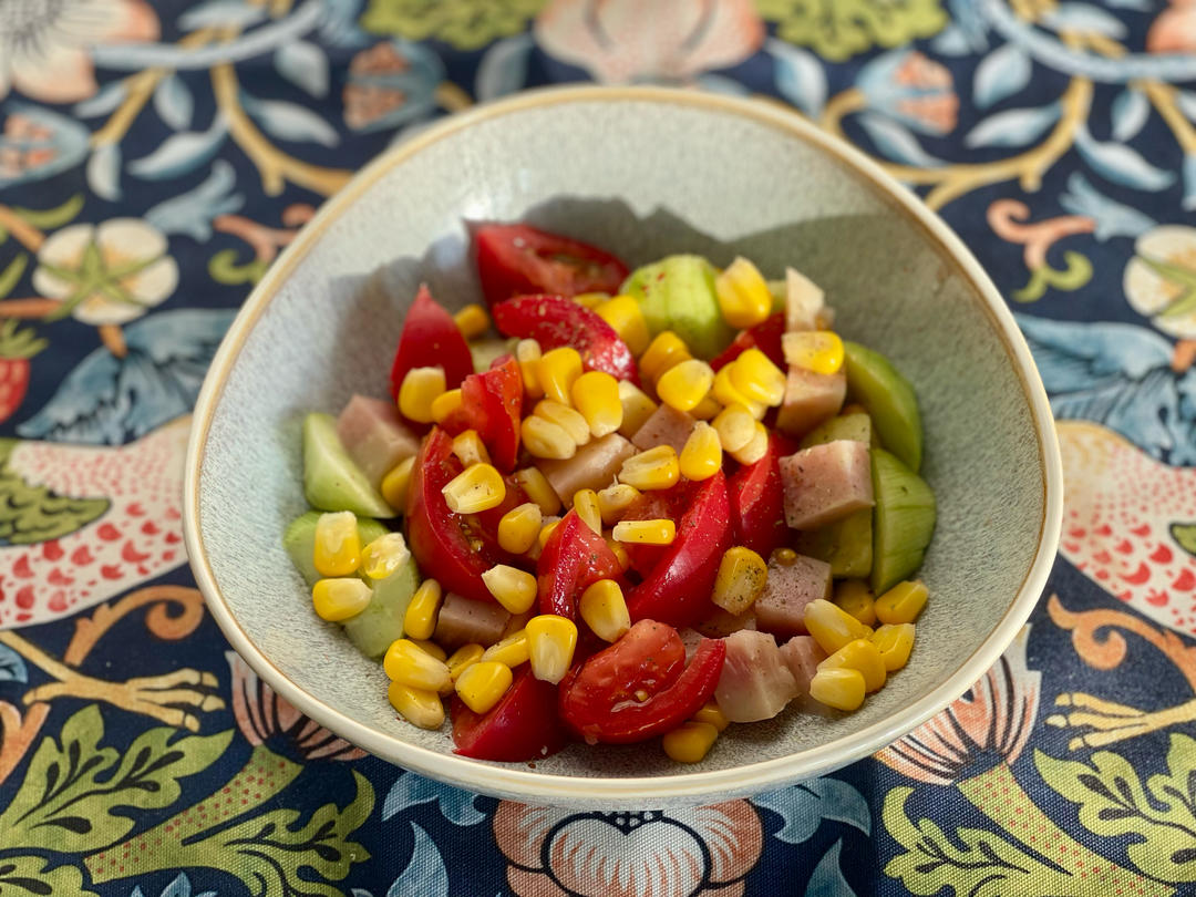 番茄🍅黄瓜🥒松仁小肚玉米粒沙拉🥗,红米肠,草莓覆盆子水果饮。