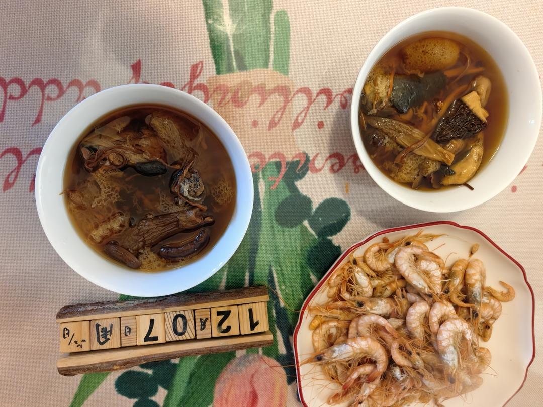 乌鸡虫草菇汤、白灼红虾