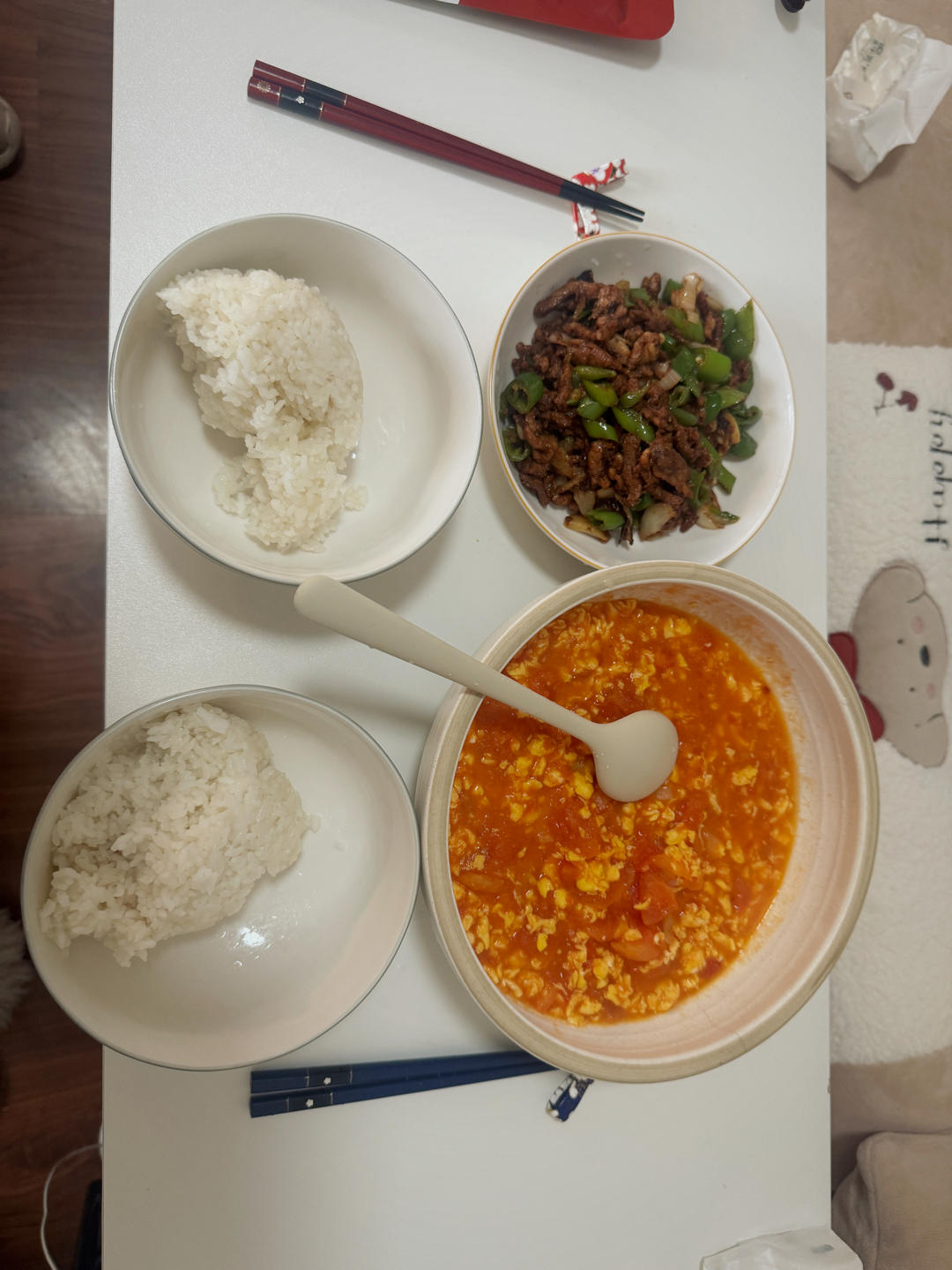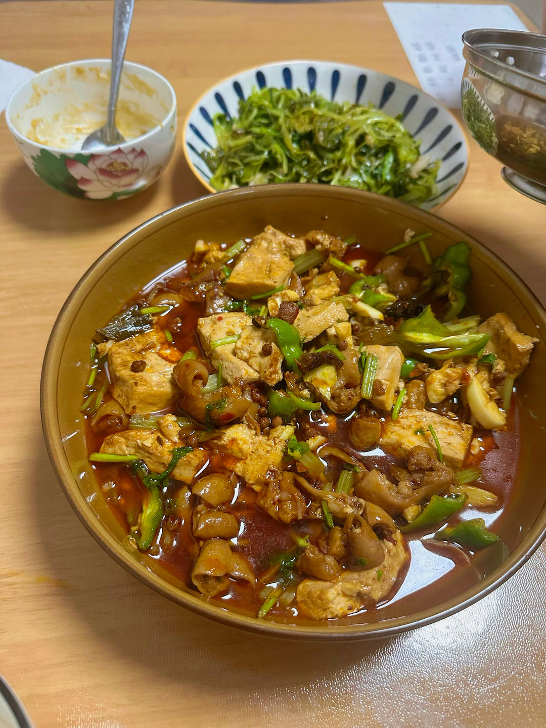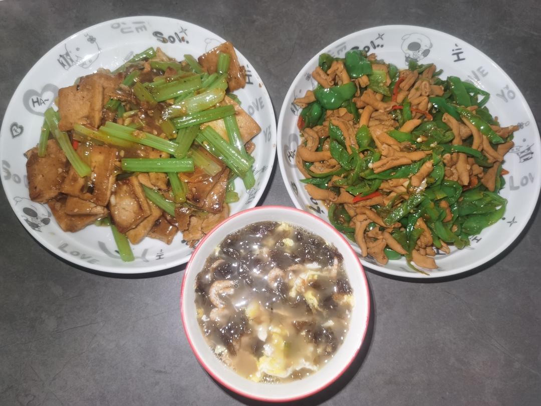妈妈做的午餐,辣椒炒鸭肠、香煎芹菜豆腐烩、紫菜鸡蛋虾皮汤,配杂粮米饭。我直接用鸭肠拌饭...