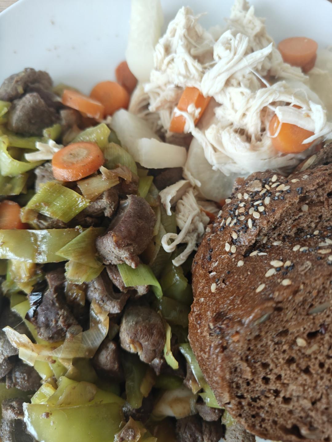 酱油蚝油花椒油料酒香油韭葱青椒胡萝卜小牛肝+白萝卜红萝卜鸡肉丝
