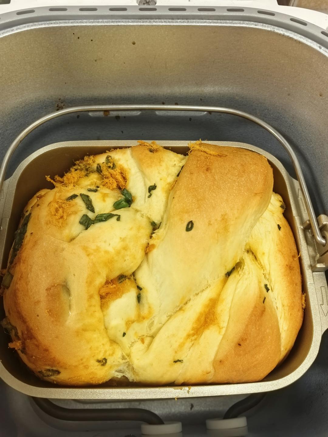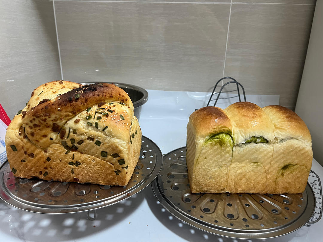 这个面团做了两个口味香葱肉松和抹茶奶酥的,面包体软软的非常香