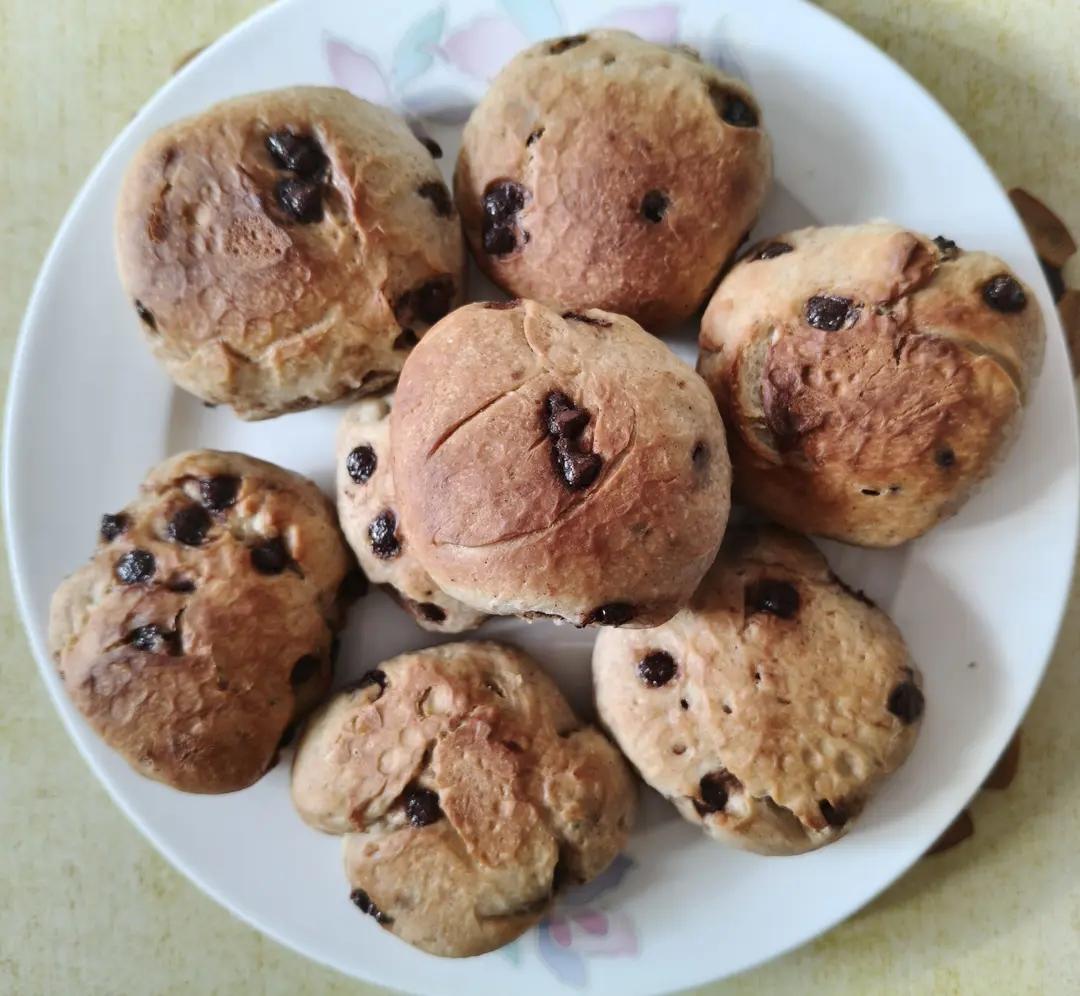 没有巧克力粉。用高筋面粉加荞麦面,既可替代中筋粉,又增加一点儿棕色。糖减半。