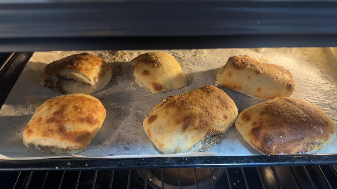 无意中翻到这个菜谱,和平时用的面水比例差不多,用做参考,铺馅儿前刷了层油酥,做了一个猪肉韭菜馅和牛肉馅的,都很好吃