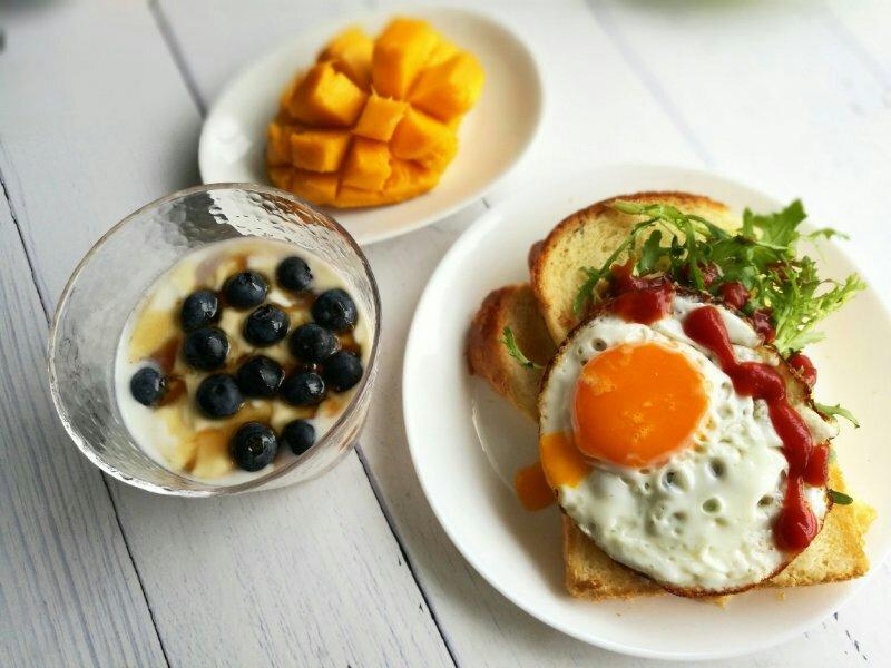 自制北海道吐司,番茄酱+苦菊,煎蛋,蓝莓蜂蜜+自制酸奶,芒果~