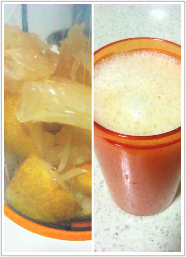 ,这是个不标准的,家里竟然没有绿叶菜了,所以只有水果了,但是想说柚子和梨太配了!!好好喝!