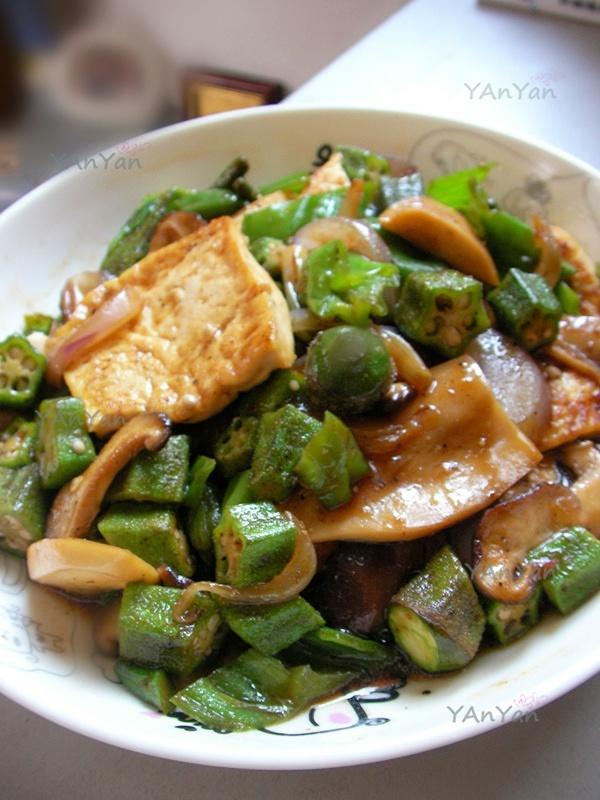 1.煎豆腐不破 我是没有什么原理.反正就放着 放到它有那种BOBOBO要鼓的感觉 就拿筷子撩起来看一下 颜色黄了 就撩个翻面 没黄继续躺 中间的翻身时候用锅铲扶一下就好.出锅怕破 要不整锅滑出来 要不拿个大盘子盖锅上直接翻扣 2.额外勾芡很肥.秋葵下了之后本身就带粘液就跟勾芡差不多了.控制体重的话这个菜直接当饭没什么负担 3.秋葵非常养胃 说吃不惯的大概都是烧久软了 只要下锅迟炒开了就上来 口感跟四季豆差不多的其实
