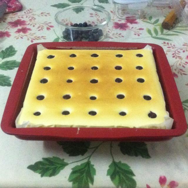 倒入垫好硅油纸的烤盘,震掉大泡泡,铺蓝莓;放入预热好的烤箱,水浴法,165度,中下层35分钟;好后在烤箱焖10分钟;