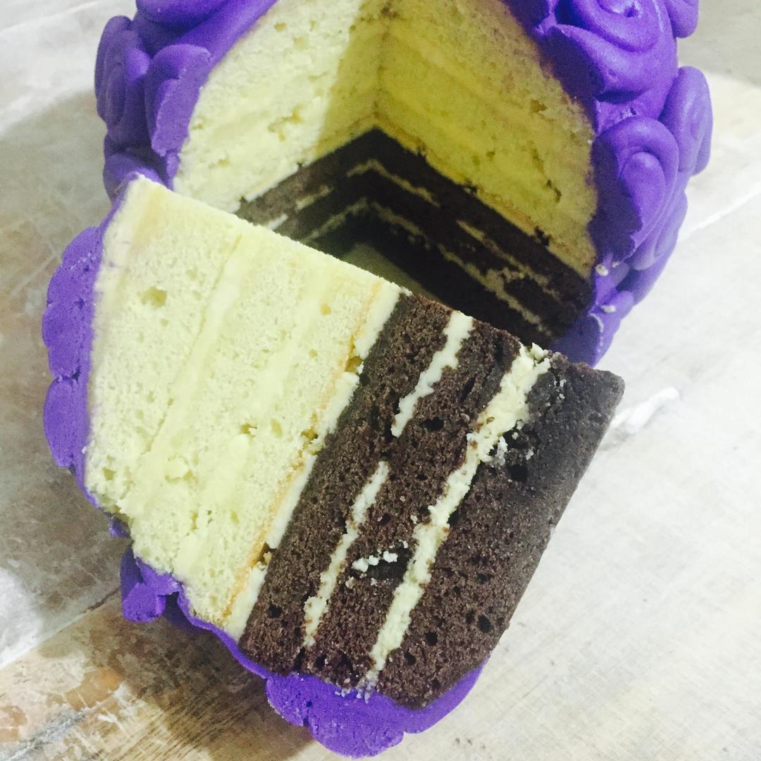 按照上面的顺序叠出来,蛋糕切面会是一层可可味,一层原味的,看起来比较好看,我这个没有用这个方法,所以切面是黑白分明的两部分。。。