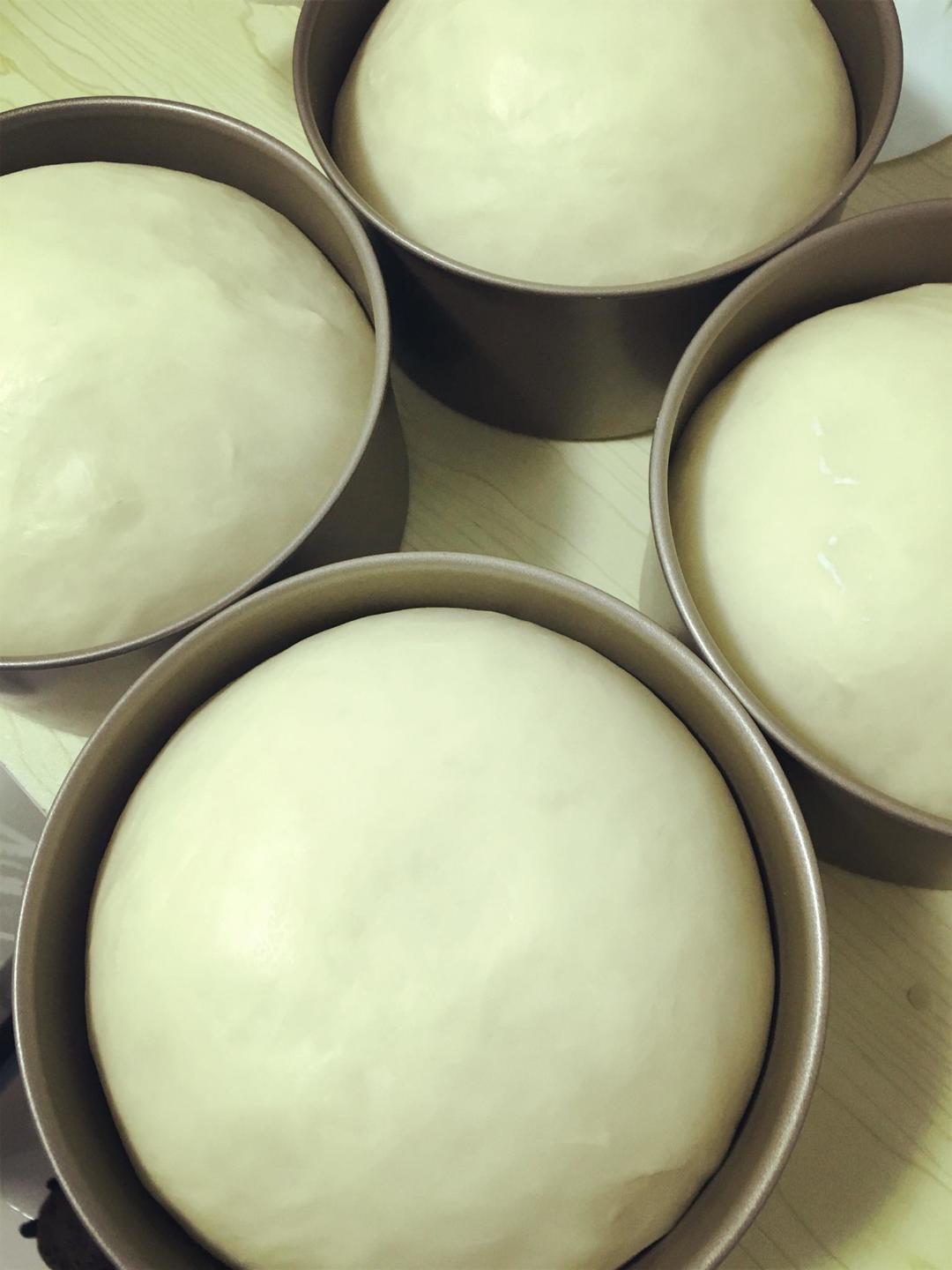 取出面团,用擀面杖排气,分成两个面团,放入两个六寸不沾模具中,盖保鲜膜进行二次发酵