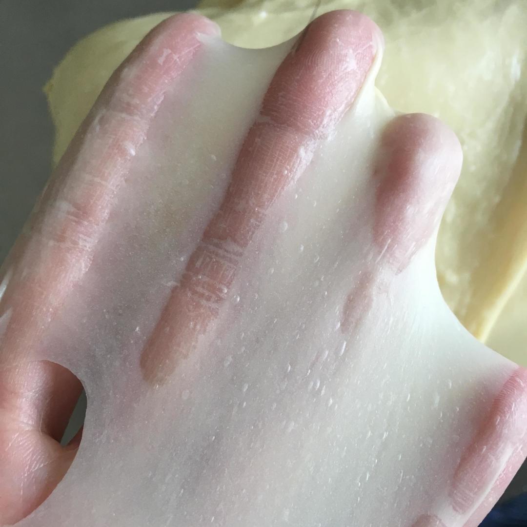 加入黄油后,一档搅拌混合后,三档揉面至完全阶段。即出手套膜,破洞边缘为光滑状,如为锯齿状,再揉几分钟