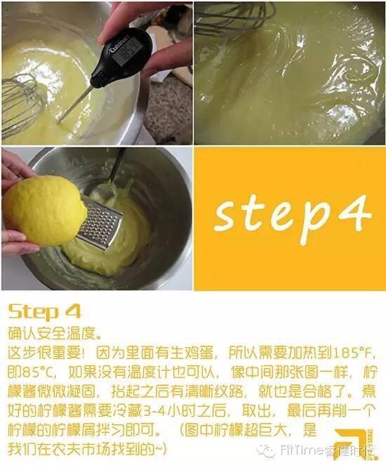 确认安全温度 这一步很重要 因为里面有生鸡蛋 所以需要加热到85° 如果没有温度计 也可以像中间那张一样 柠檬酱微微凝固 抬起之后有清晰纹路 也就是合格了 煮好的柠檬酱需要冷藏3-4小时之后取出 最后再削一个柠檬的柠檬屑拌匀即可