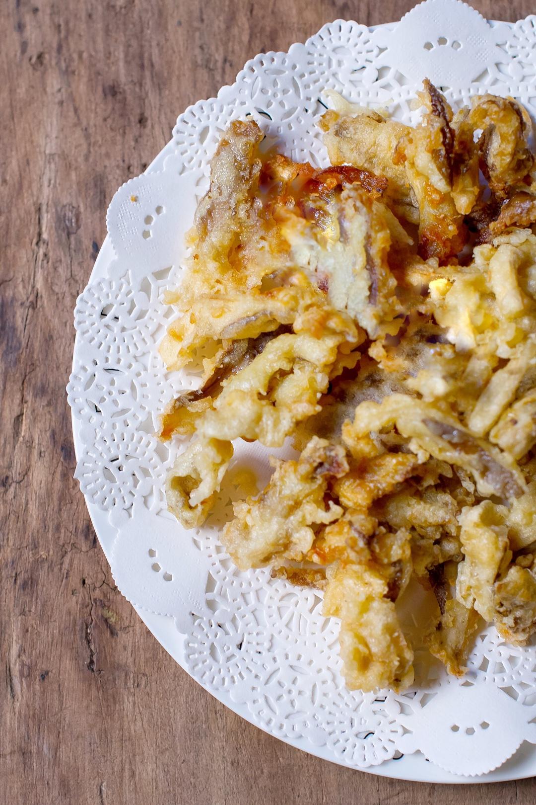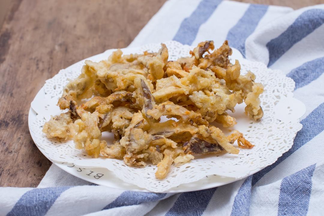 平菇去掉根部撕成一条条,不要撕的太小太细,后面一炸就没有了