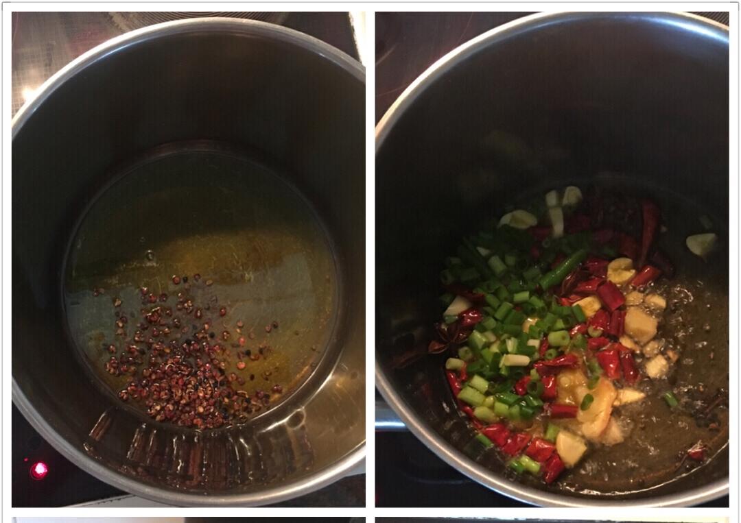 油锅烧热,放入花椒大料,煎香,放入葱姜蒜、辣椒,翻炒一会