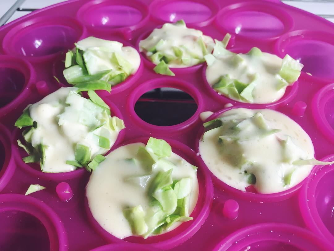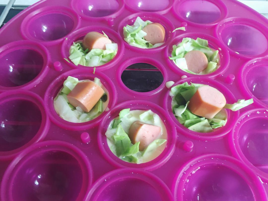 然后先放一些到模具中,加入香肠后再盖一些蔬菜面糊上去,盖上盖子之后190度烤18分钟。