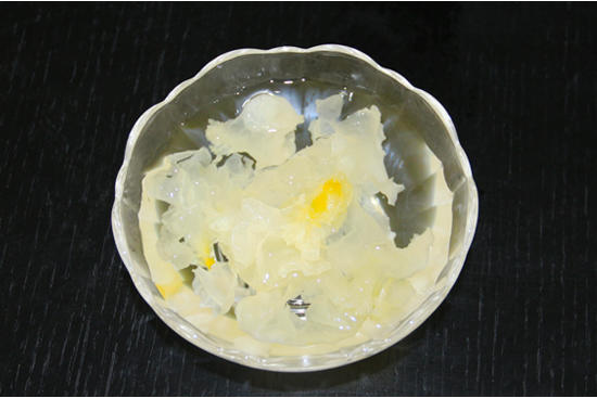 待银耳变软后,用剪刀剪去黄色硬结部分。然后再剪成小碎块儿,越碎越好。