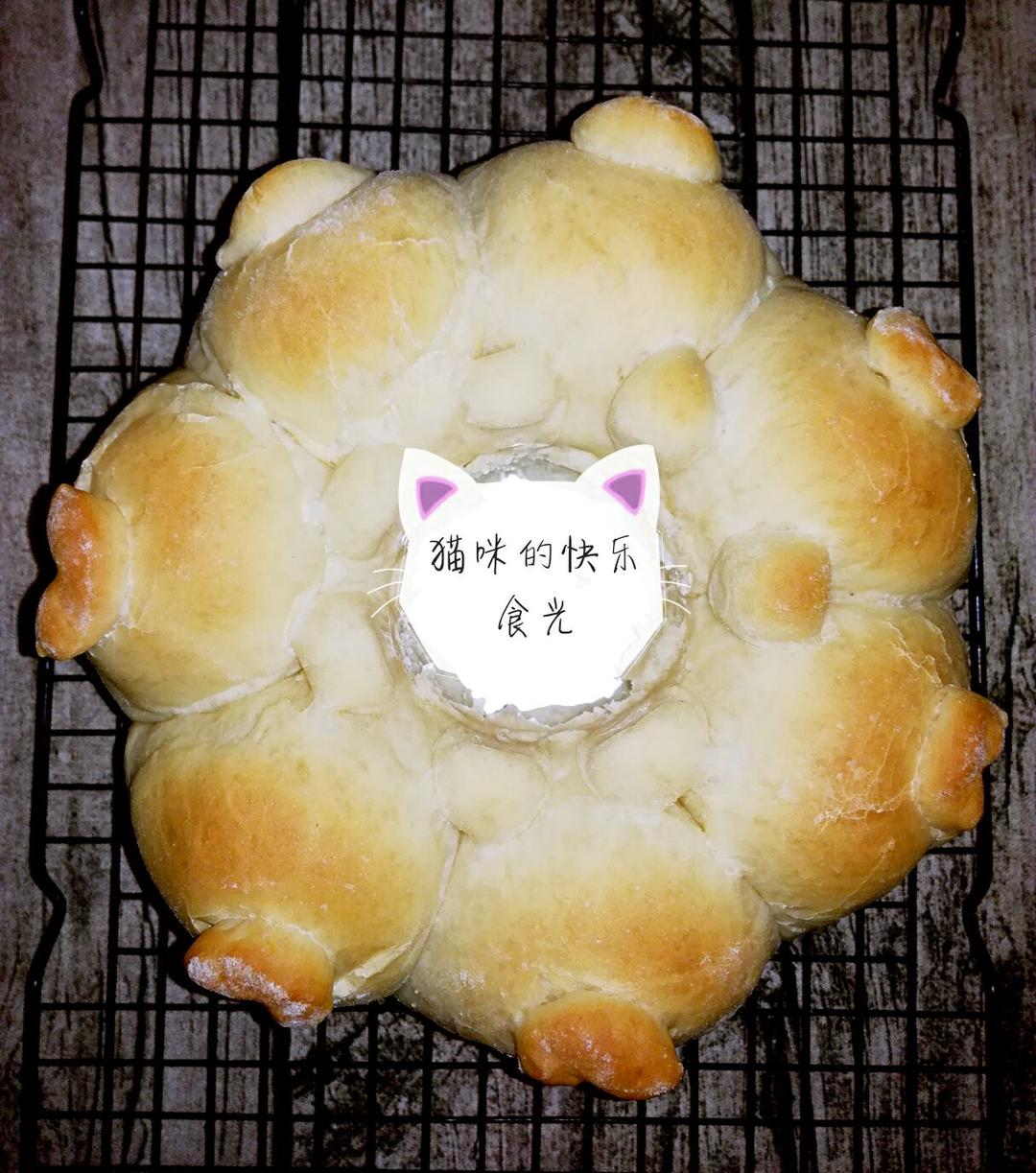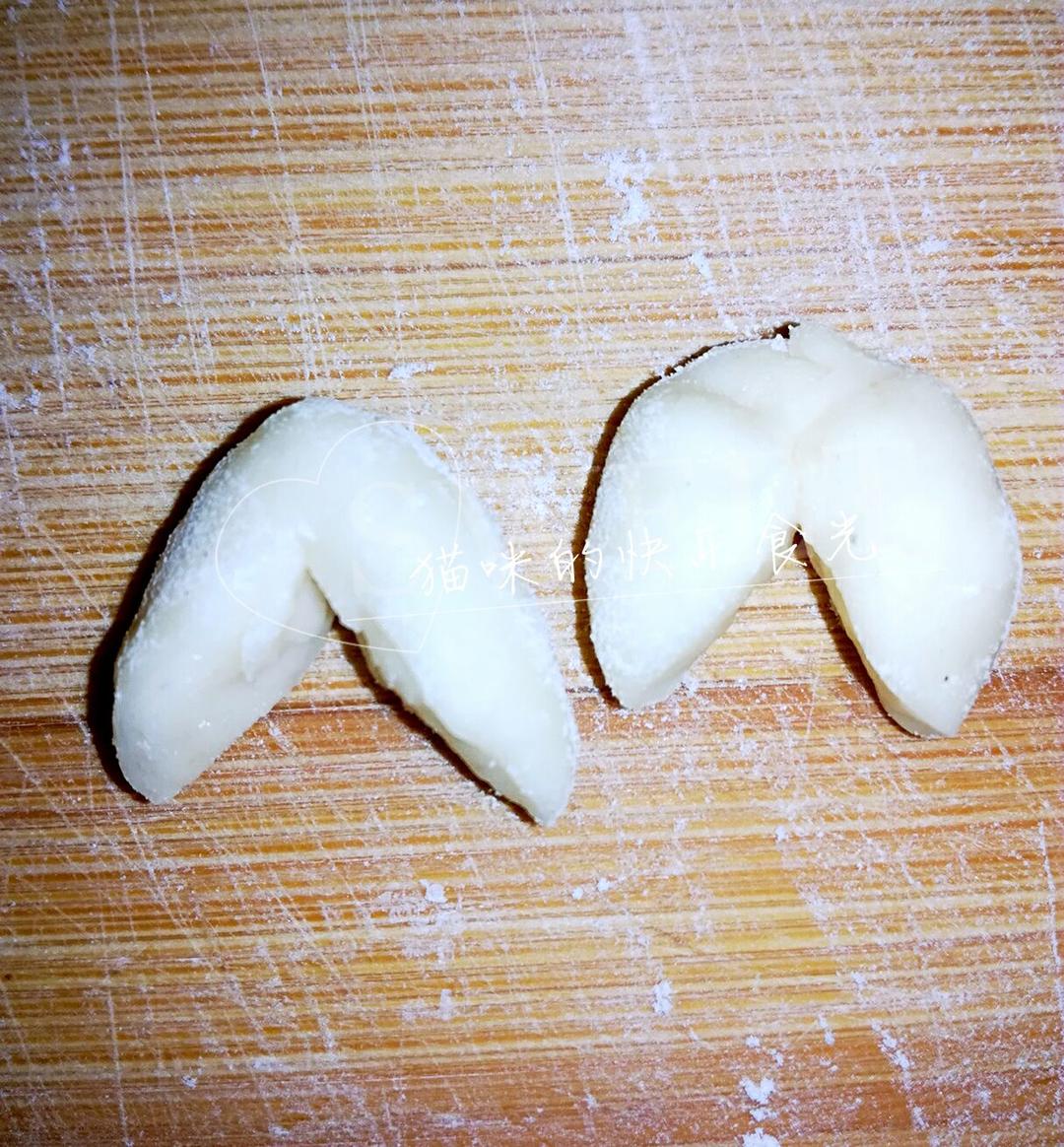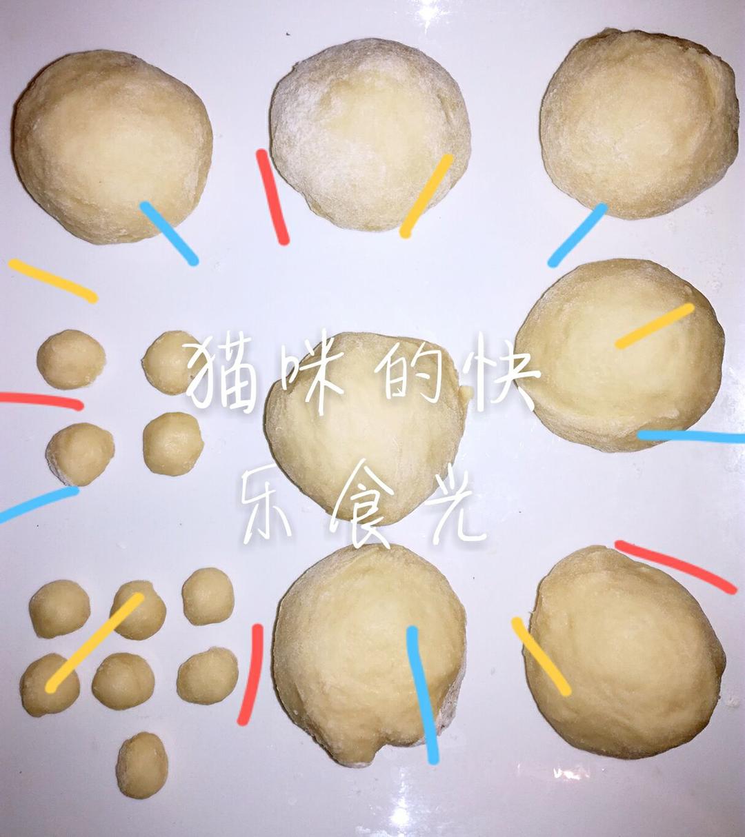 2克小面团揉圆,摆放在面胚接缝处做成耳朵。