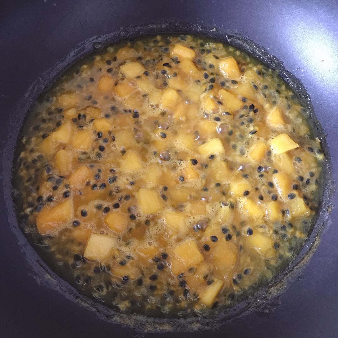 百香果切开把果肉和果汁倒出来,芒果切粒(我不喜欢芒果太烂所以切的粒稍大一些,看个人喜好决定)。然后加入白砂糖搅拌均匀后盖上保鲜膜放冰箱腌制一个晚上。