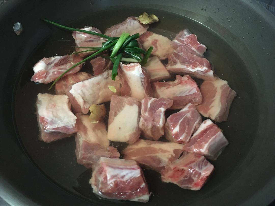 排骨冷水下锅,同时放葱结、2片姜和2勺料酒,大火烧开排骨肉质发白,捞出排骨温水洗净表面浮沫,沥干水分待用。