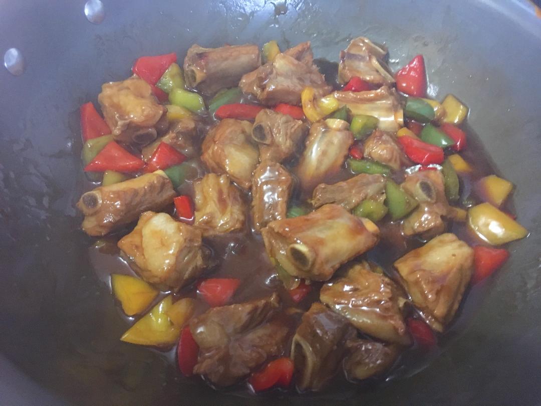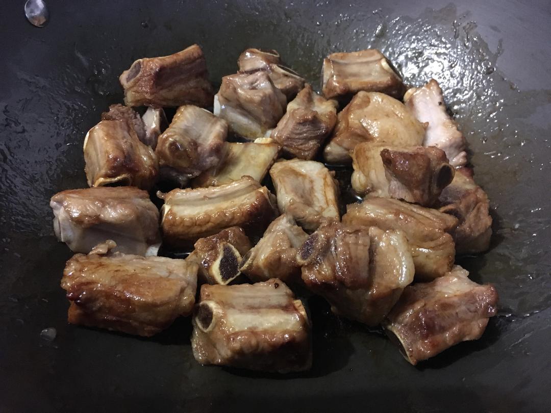 迅速倒入排骨,用铲子不停的翻炒,等排骨均匀裹上金黄色的糖浆。