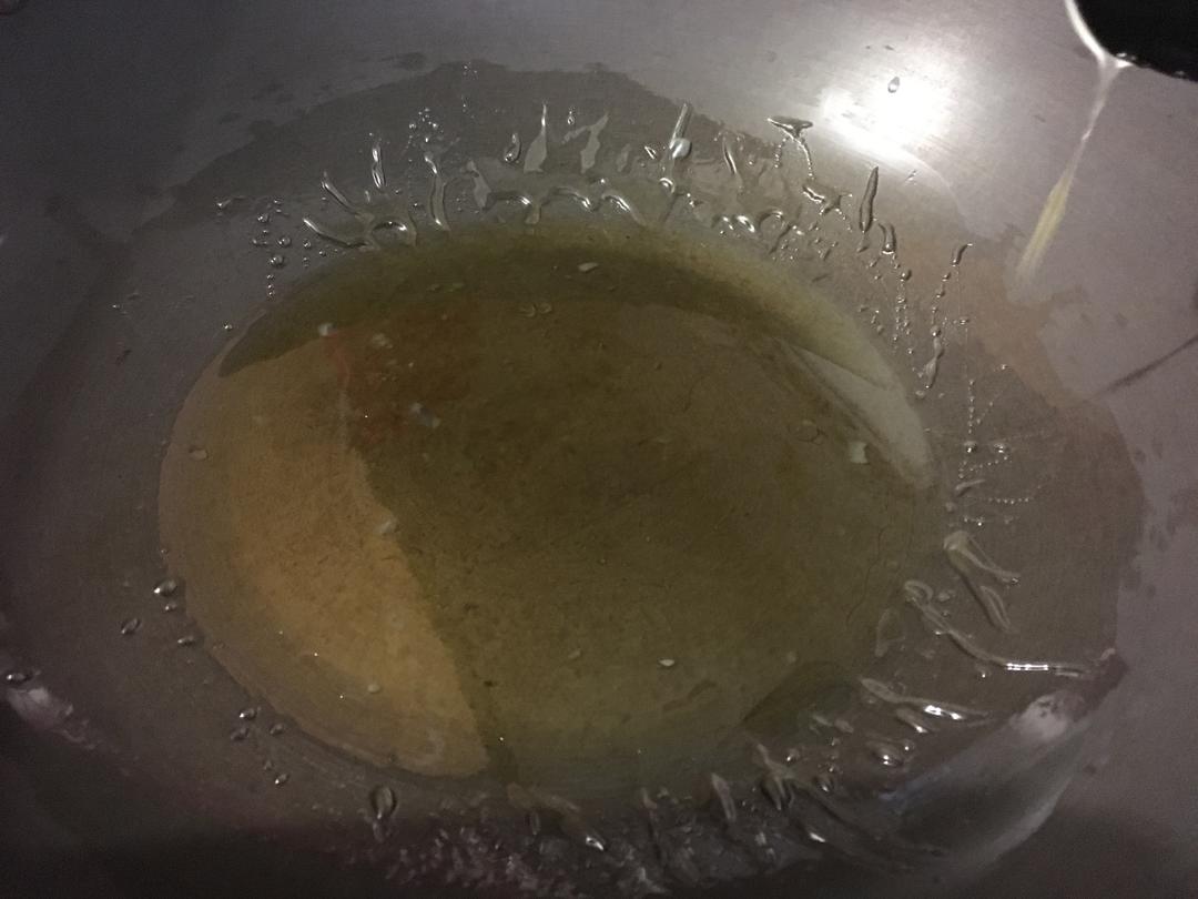 锅内放2勺油和2勺冰糖,中小火加热,用铲子不停翻炒冰糖。